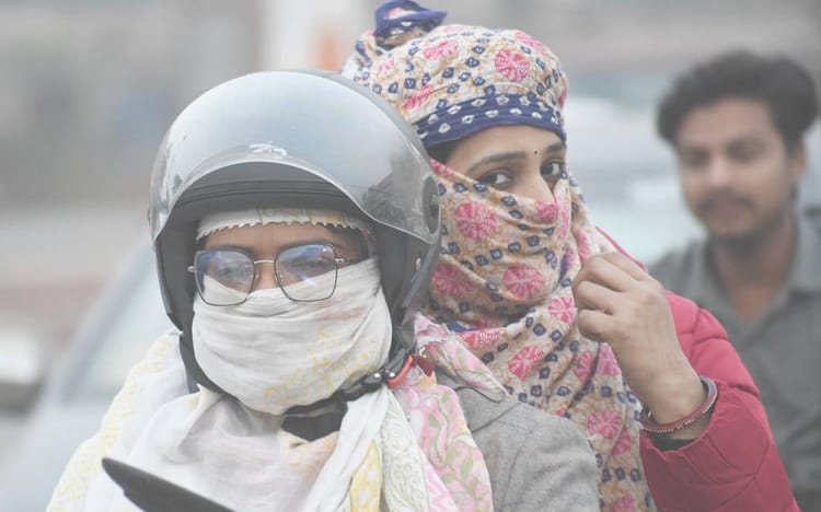 प्रदूषण से बचने के लिए मास्क लगाए और मुंह बांधे नजर आए लोग