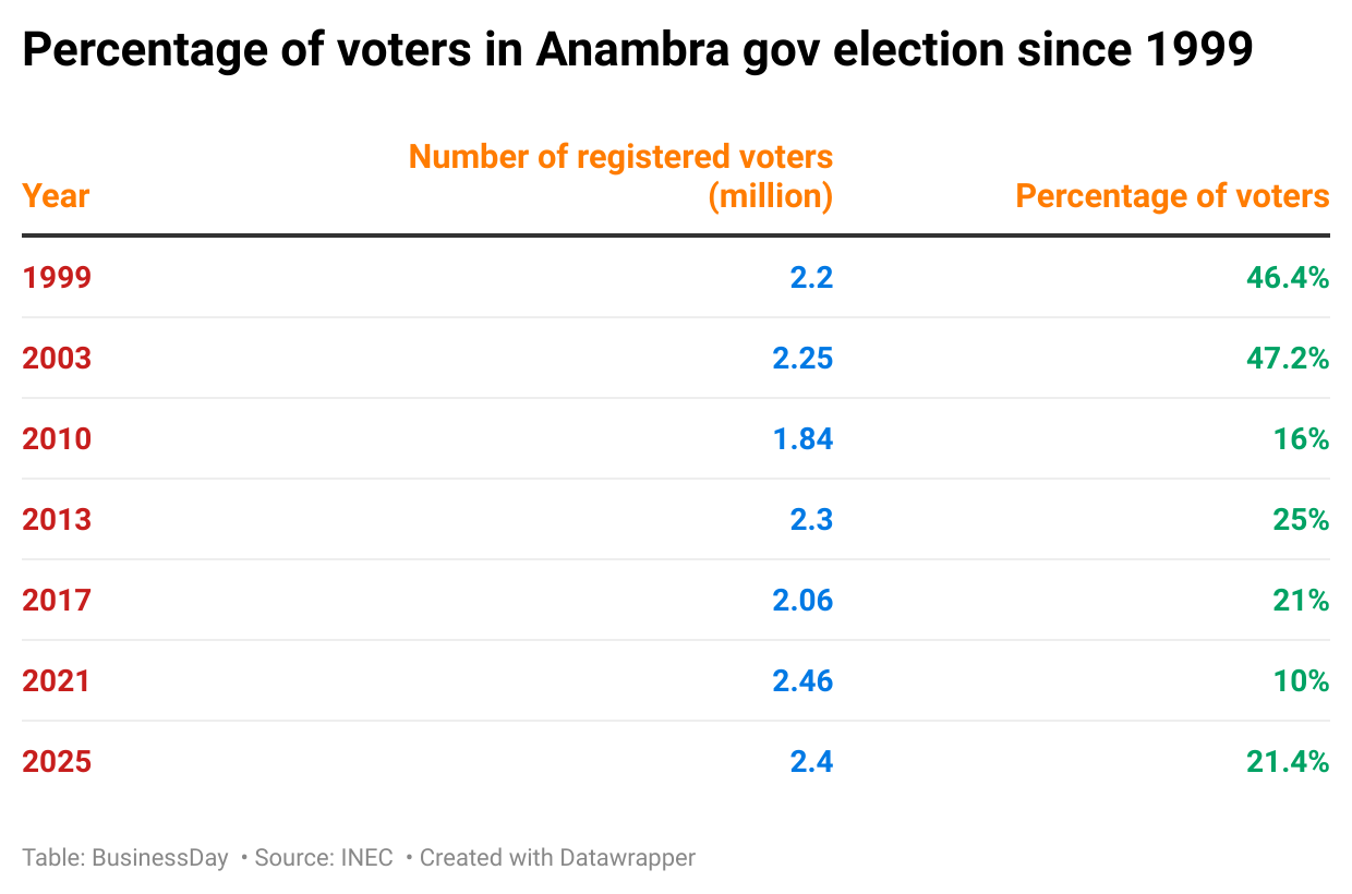 Upon the return to democratic rule in 1999, Anambra State has consistently recorded low voter participation in gubernatorial elections.