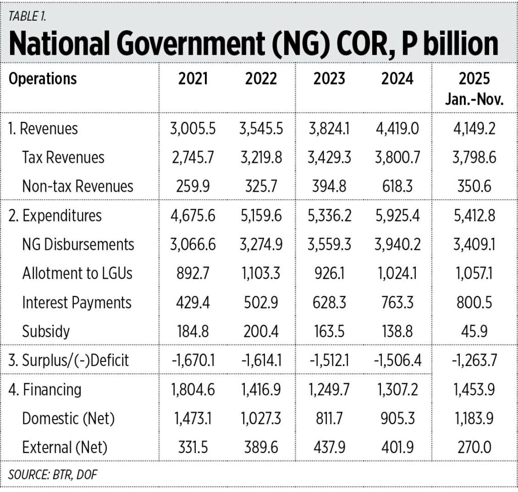 The bulk of our budget deficit comes from interest payments alone, averaging P1.7 billion/day in 2023; P2.1 billion/day in 2024; and P2.4 billion/day in 2025. New financing or net borrowing in the first 11 months to 2025 was P1.45 trillion (See Table 1).