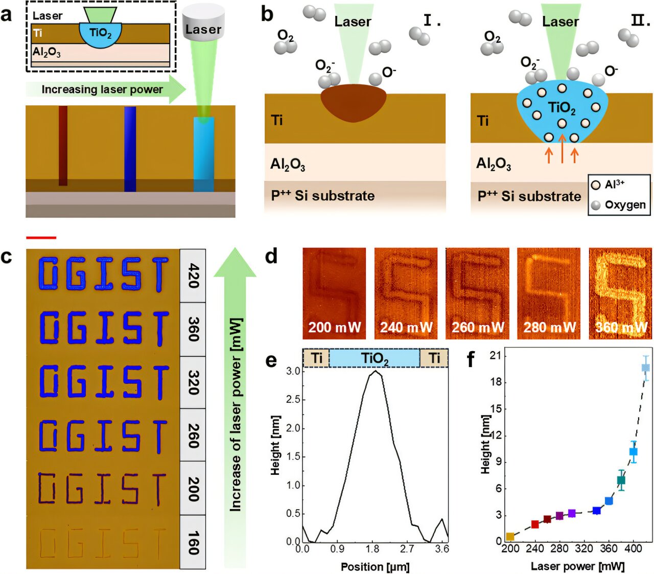 When a film of aluminum oxide (Al2O3) is placed on top of a thin metal film of titanium (Ti) and irradiated with a laser for a few seconds, aluminum ions diffuse inside as titanium combines with oxygen to convert into titanium oxide (TiO2). In this process, the balance of electrons is broken down, which creates holes and subsequently forms a p-type semiconductor in which holes, instead of electrons, carry current.
