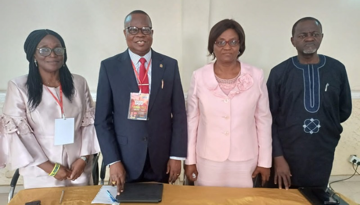L-R, Adeola Salako, Director, Media and Publicity, Rhema Christian Church and Towers (RCC&T), Taiwo Akinola, Presiding Bishop, RCC&T; Ireti Akinola, bishop and wife, and Paul Salako, one of the elders of the church, at the major conference of the 34th Rhema World Conference in Sango Ota, Ogun State.