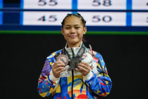 Ms. Peralta fell just short of winning two gold medals, but fell short in the end and won a silver in the snatch with a lift of 87 kilograms (kg) and a bronze in the clean and jerk, where she lifted 100 kg in the girls' 53 kg category.