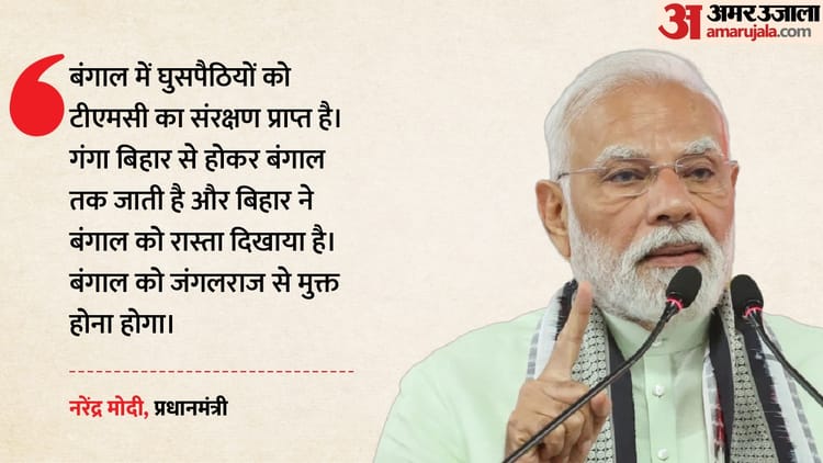प्रधानमंत्री ने कहा कि केंद्र सरकार देश के नागरिकों के साथ कंधे से कंधा मिलाकर चल रही है। उन्होंने कहा कि जीएसटी ने बंगाल समेत पूरे देश के लोगों को बड़ी राहत दी है और दुर्गा पूजा और अन्य त्योहारों के दौरान देशभर के लोग इससे काफी लाभान्वित हुए हैं। प्रधानमंत्री मोदी ने आरोप लगाया कि बंगाल में घुसपैठियों को टीएमसी का संरक्षण प्राप्त है। पीएम ने कहा कि गंगा बिहार से होकर बंगाल तक जाती है और बिहार ने बंगाल को रास्ता दिखाया है। उन्होंने कहा कि बंगाल को जंगलराज से मुक्त होना होगा। प्रधानमंत्री ने दोहराया कि वे पूरे दिल से बंगाल के लोगों के लिए समर्पित हैं और राज्य के लिए फंड और नीतियों की कोई कमी नहीं है।