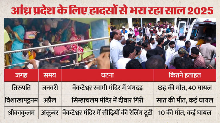 आंध्र प्रदेश में इस साल अब तक तीन बड़े मंदिर में हुए हादसों में 22 लोगों की जान जा चुकी है और करीब 100 लोग घायल हुए हैं। शनिवार को श्रीकाकुलम जिले के कासीबुग्गा शहर के श्री वेंकटेश्वर मंदिर में हुआ हादसा इस श्रृंखला का सबसे नया घटनाक्रम है।